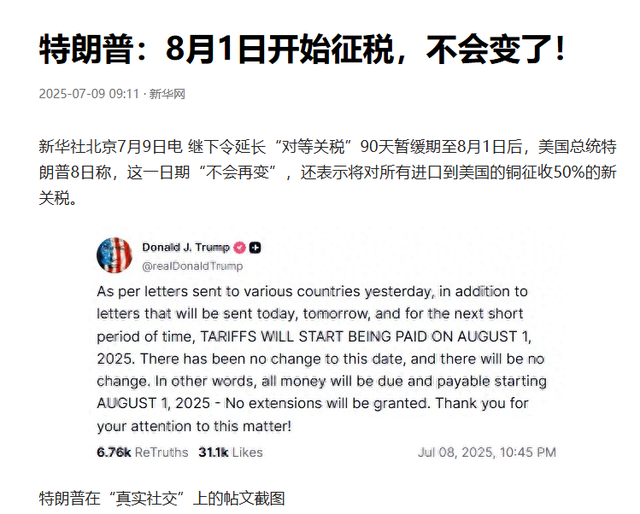 面对这种超出预期的全面抵抗,特朗普明显心虚了。在宣布加征关税的当日,他就紧急签署了一份总统令,宣布将高额关税的正式执行日期延后至8月1日。